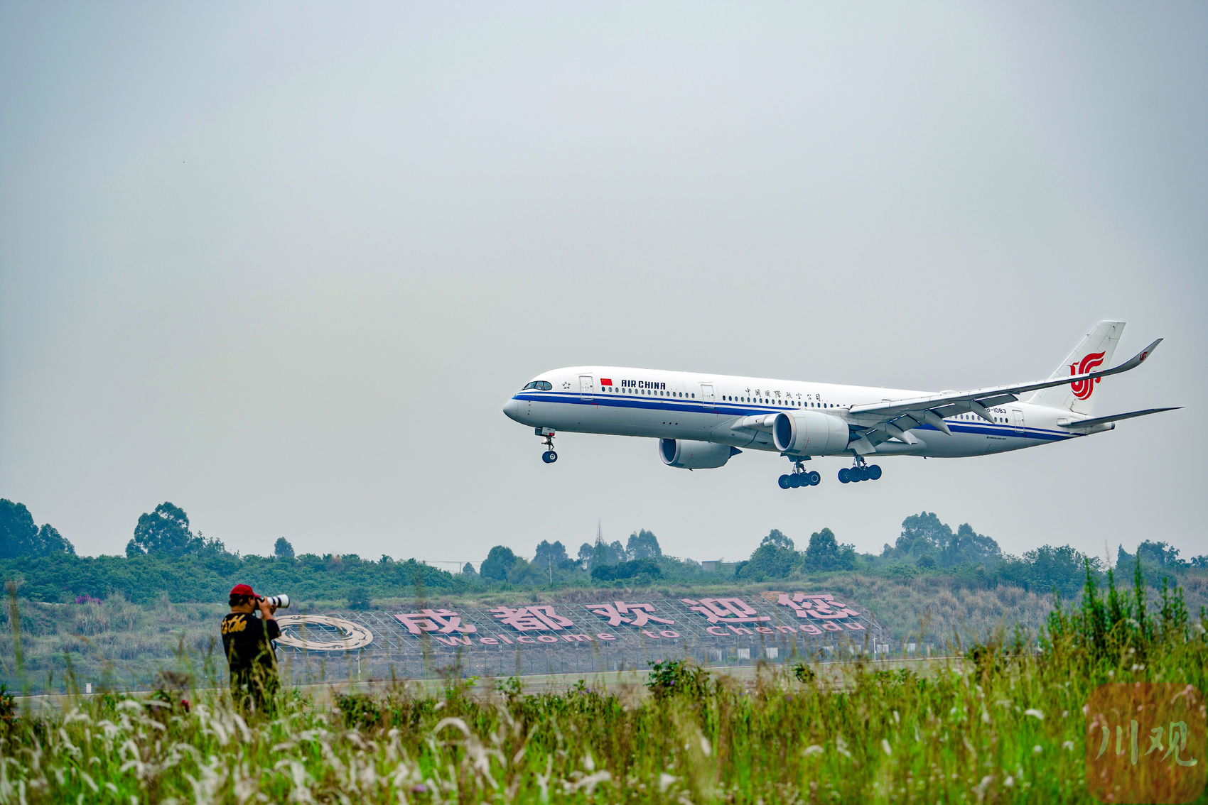 2023 年 5 月 15 日,成都双流植物迷宫旁,国航客机降落时掠过 “成都欢迎您” 标识,一名摄影爱好者正在拍摄这一画面。