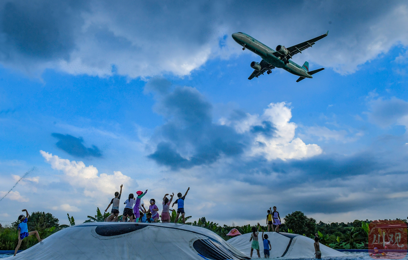 2025年8月24日,在四川省成都市双流区梦幻植物迷宫主题公园,孩子们在水池中休闲,与一架正在降落的飞机同框。
