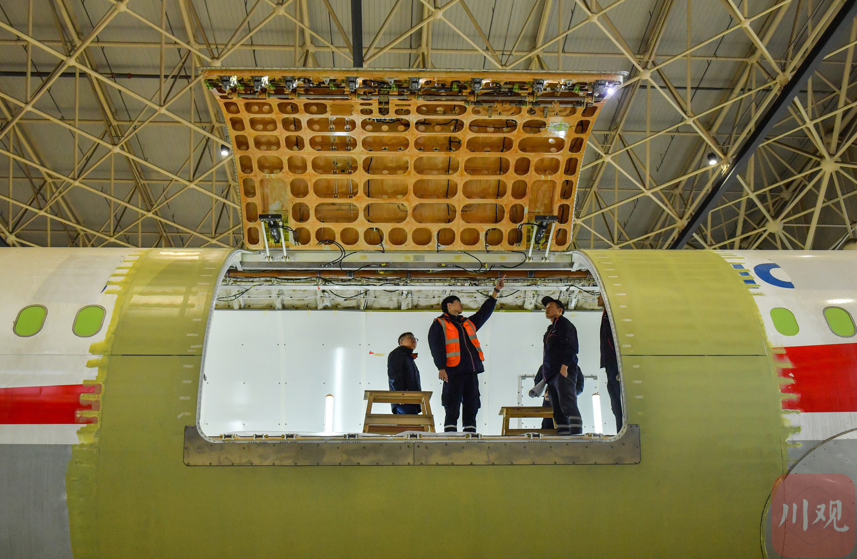 2025年12月3日,位于成都双流国际机场的四川飞机维修工程有限公司机库里,工作人员在一架空客A321客机机舱里进行“客改货”工作。