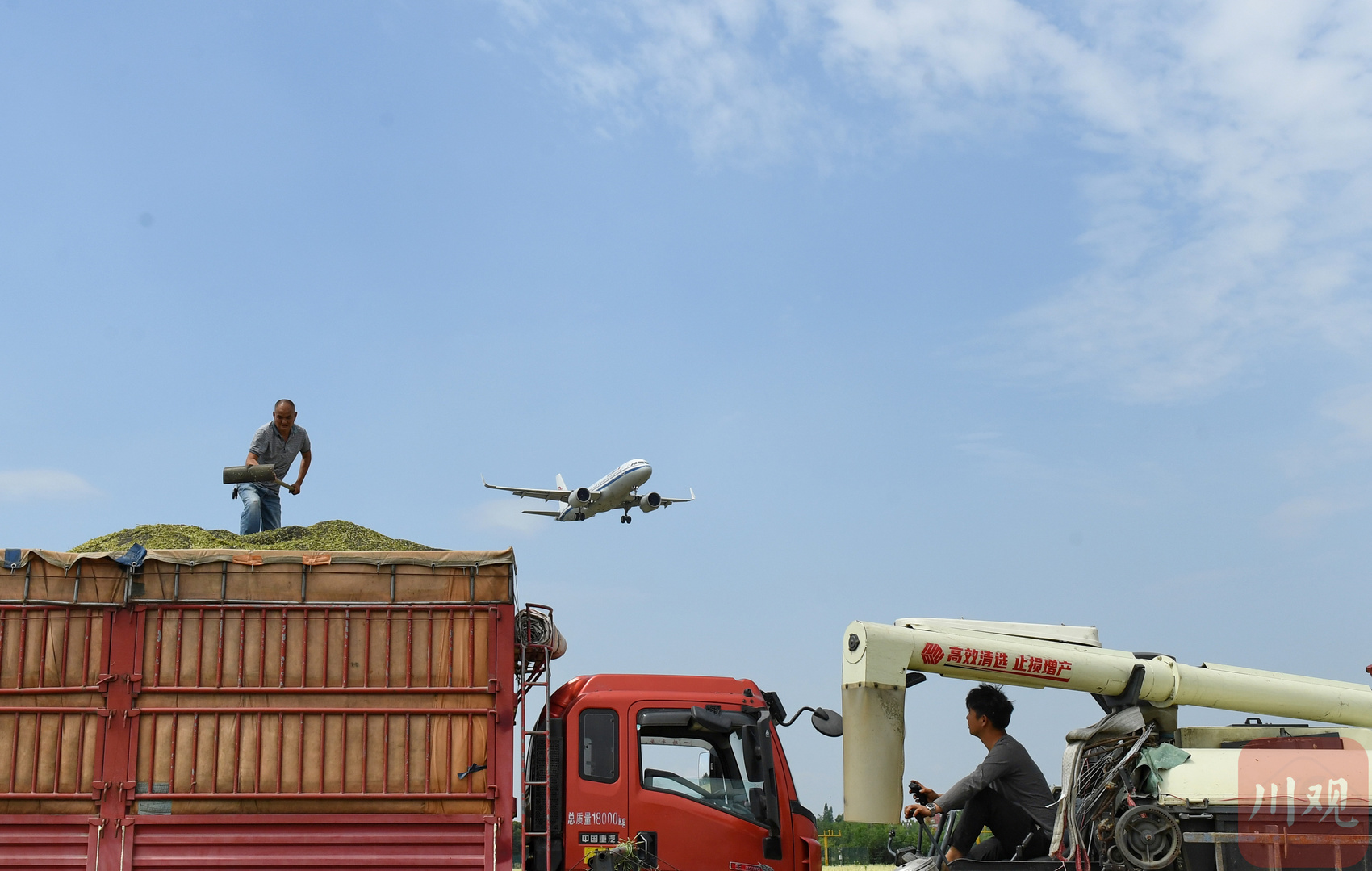 2025年5月7日,位于成都市双流区东升街道环港绿洲,收割机正在作业收割油菜籽,一架飞机从上空飞过。