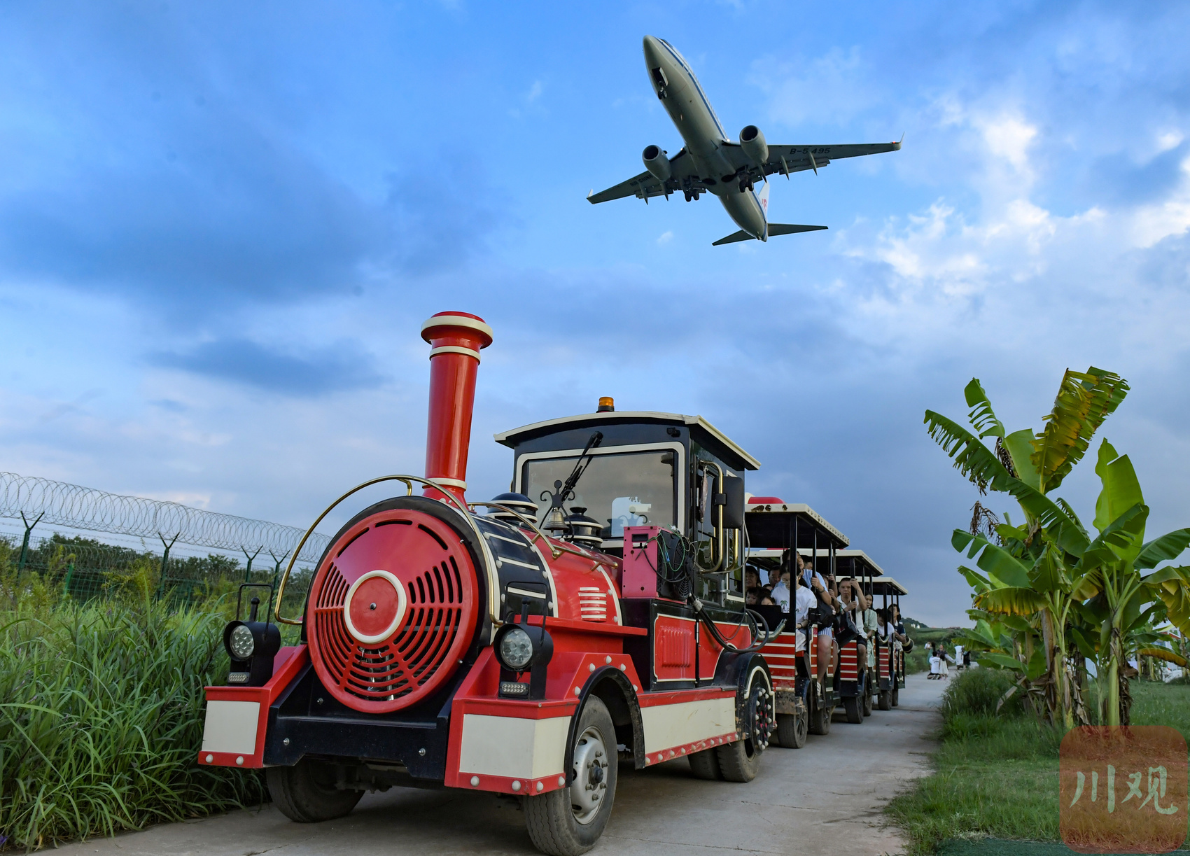 2025年8月24日,在四川省成都市双流区梦幻植物迷宫主题公园,游客体验坐小火车休闲,与一架正在降落的飞机同框。