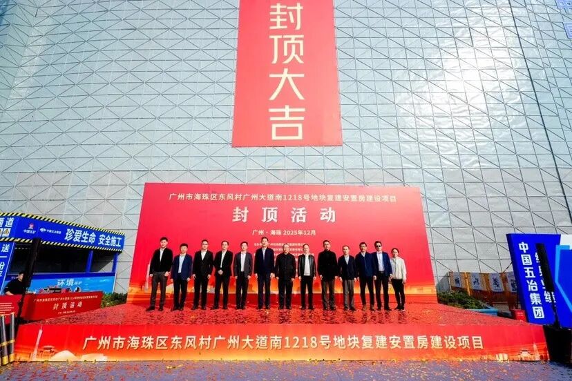 12月30日,海珠区东风村广州大道南1218号地块复建安置房项目主体结构顺利封顶。这是新中轴海珠片区城中村改造首个封顶的安置建设项目,于2024年12月27日率先动工,仅用时一年实现封顶。