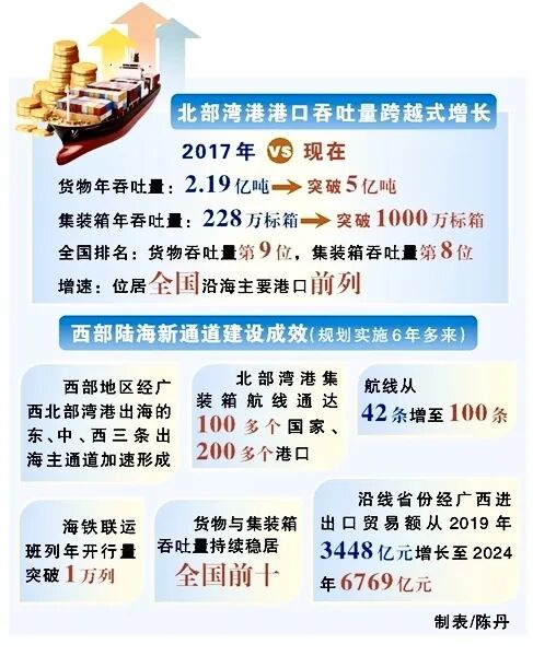向海图强,乘风蝶变。北部湾港正加速向国际门户港和国际枢纽海港跃升,港航能力跨越发展、枢纽能级显著提升、海铁联运班列实现跨越式增长,港口货物与集装箱吞吐量增速持续位居全国沿海主要港口前列,集装箱吞吐量排名跃升至全球第23位……