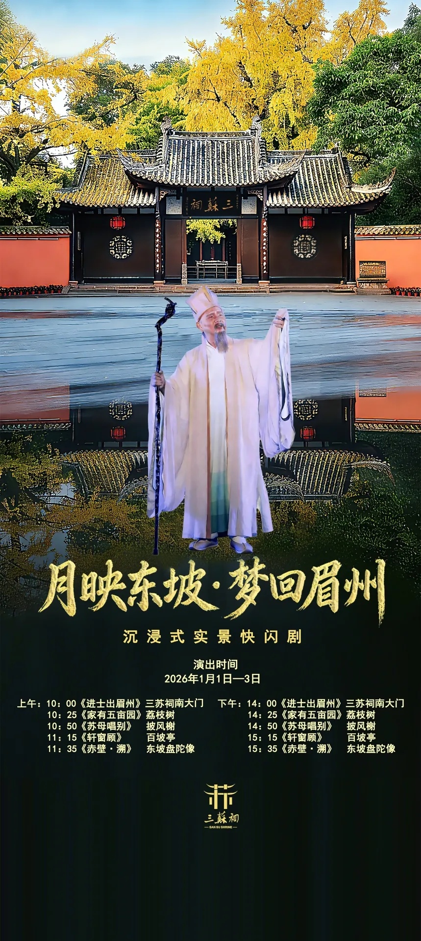 演出分上午、下午两场循环上演,游客可跟随动线穿梭于南大门、荔枝树、披风榭、百坡亭、东坡盘陀像等标志性场景,在移步换景中感受眉州千年文脉传承。具体场次为元旦节期间每日上午10:00至11:35、下午14:00至15:35,全程无需额外购票,沉浸式融入东坡故事。