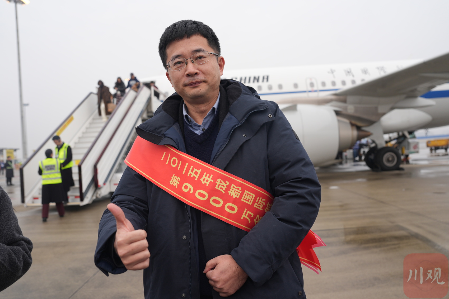 来自电子科技大学的科技工作者姜辉是第9000万名旅客, 他表示很荣幸能见证这一历史时刻,“成都航空的发展让四川和全国乃至世界的联通更顺畅,也让成都的教育和科研影响力更广。”