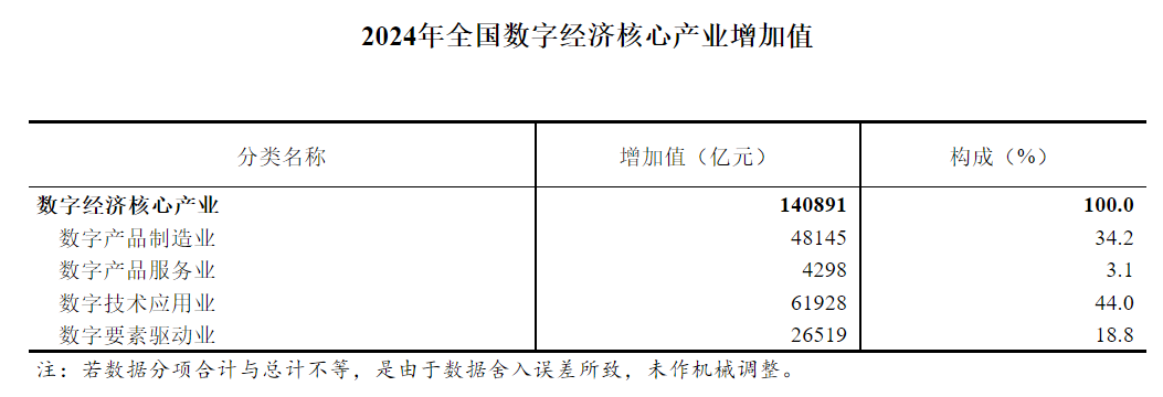 12月30日,国家统计局发布消息:经核算,2024年全国数字经济核心产业增加值为140891亿元,占GDP的比重为10.5%。