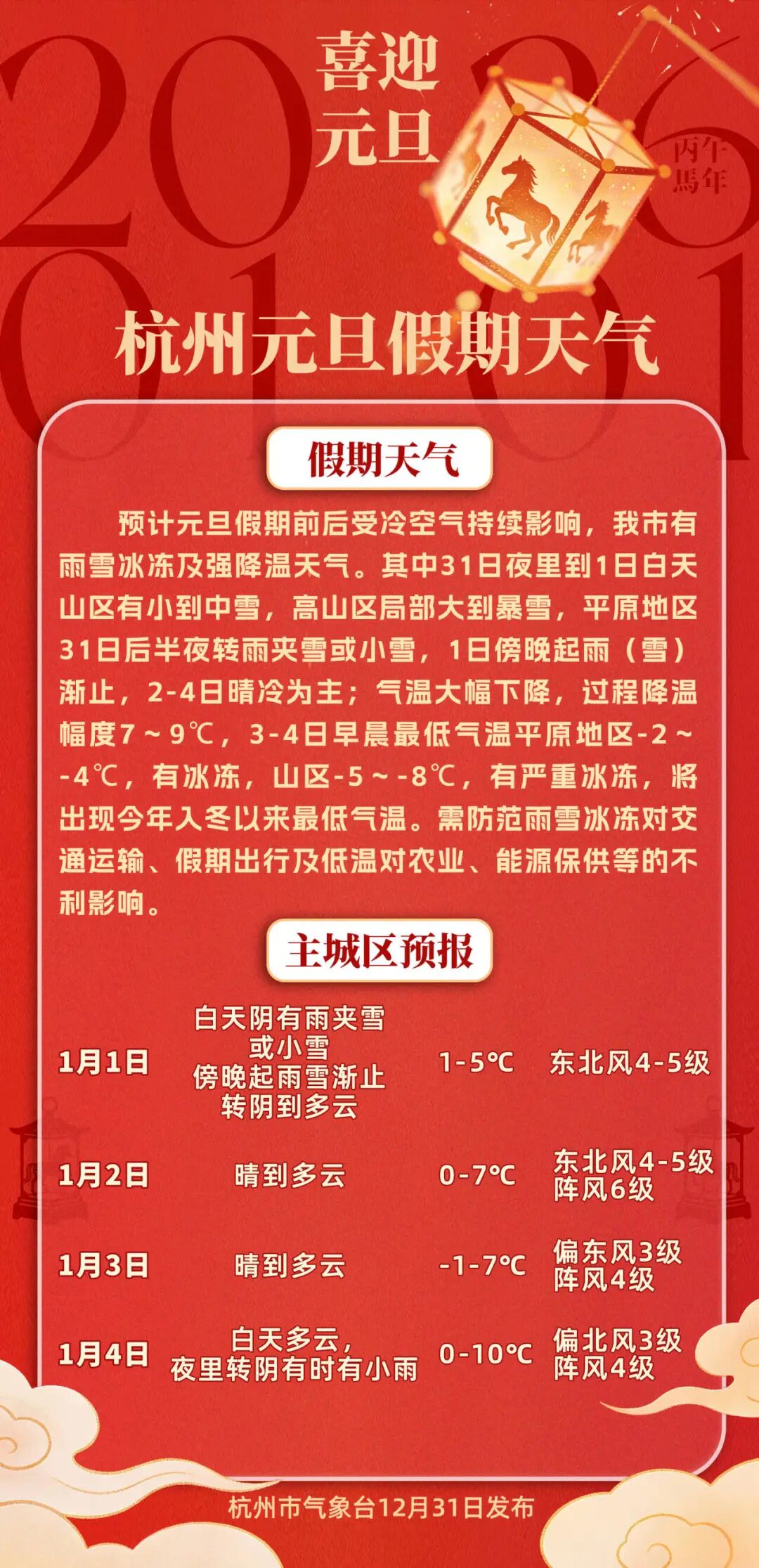 据杭州气象台最新消息,冷空气赶在年末“刷存在感”,实力不容小觑!受其持续影响,预计元旦假期前后(12月31日-2026年1月4日),杭州将迎来雨雪冰冻及强降温天气。这不仅是天气的“考验”,更是对出行计划的挑战。