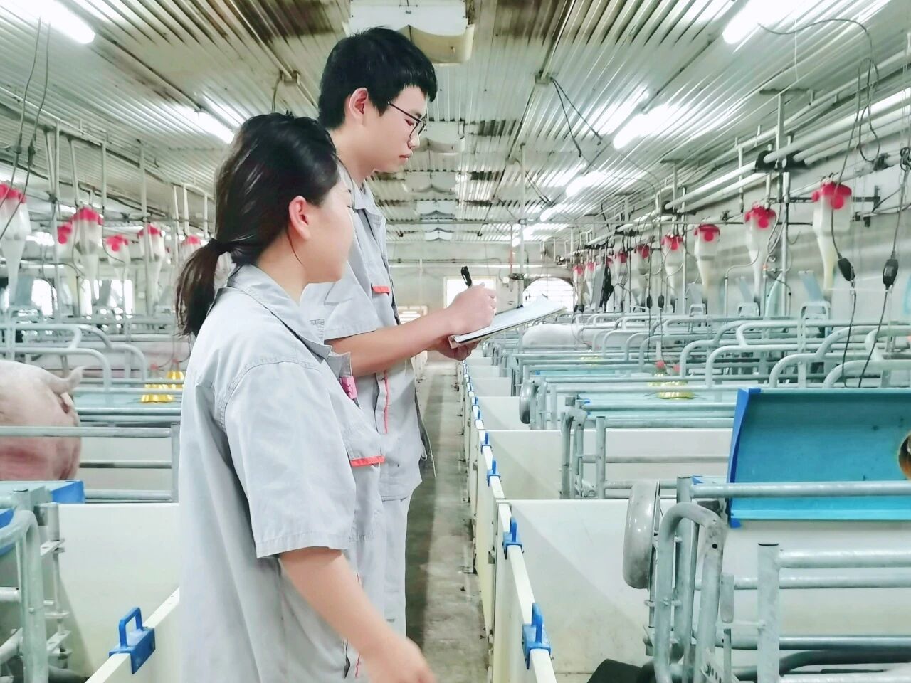师徒两人在记录现场猪群情况。