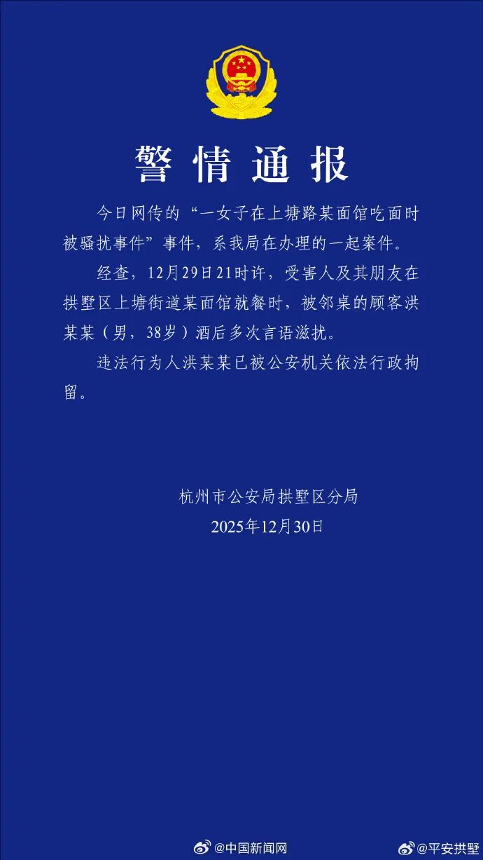 今日网传的 “一女子在上塘路某面馆吃面时被骚扰事件” 事件,系我局在办理的一起案件。经查,12 月 29 日 21 时许,受害人及其朋友在拱墅区上塘街道某面馆就餐时,被邻桌的顾客洪某某(男,38 岁)酒后多次言语滋扰。违法行为人洪某某已被公安机关依法行政拘留。