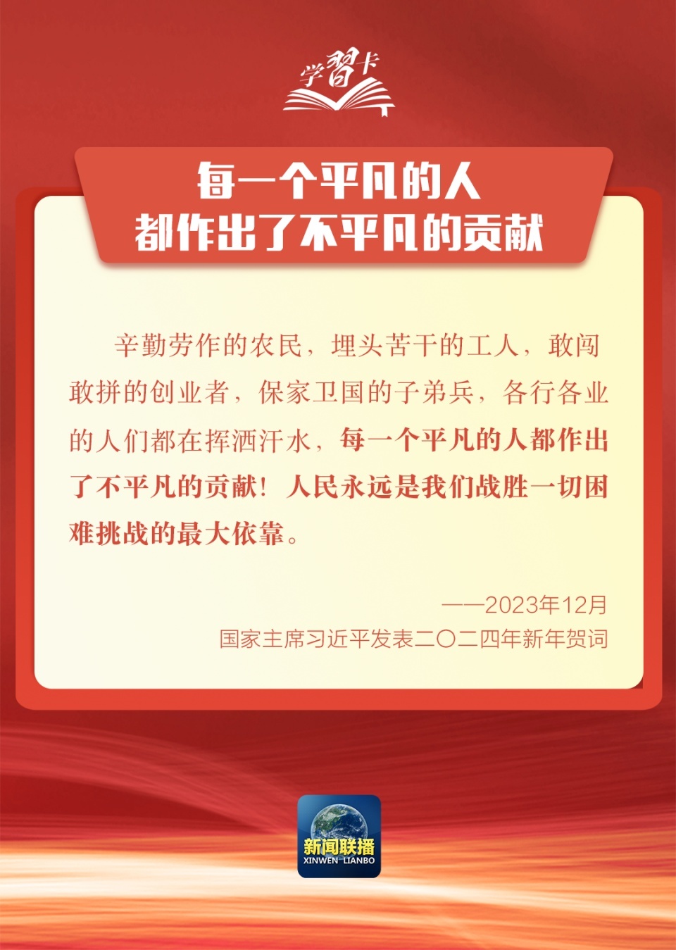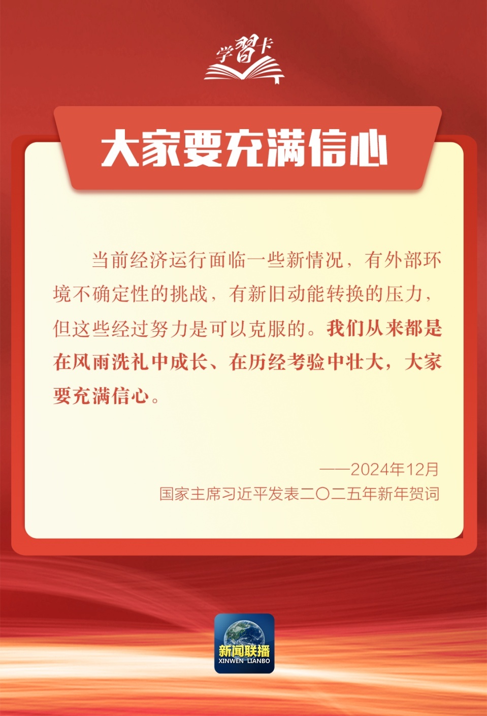 每逢新年前夕,习近平主席发表新年贺词,为亿万人民点赞、为每一位奋斗者加油鼓劲。重温这些直抵人心、催人奋进的话语,让我们满怀信心、奔赴新征程。