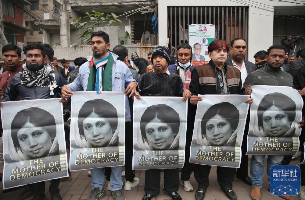 12月30日,在孟加拉国首都达卡,人们在卡莉达·齐亚逝世的医院外手持她的画像以示哀悼。新华社发