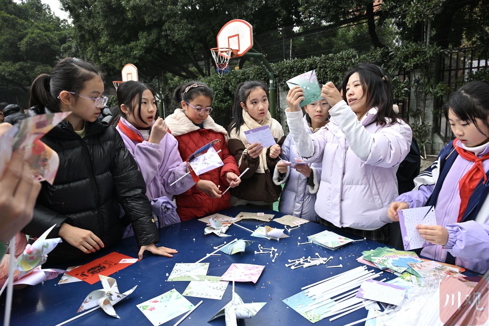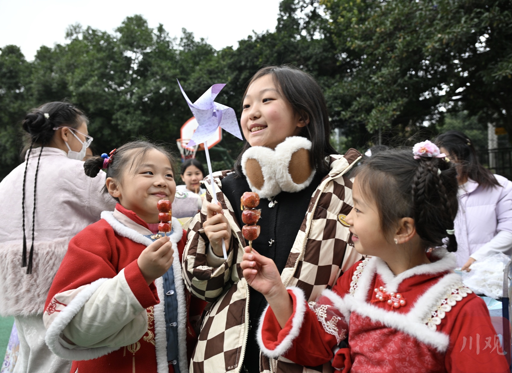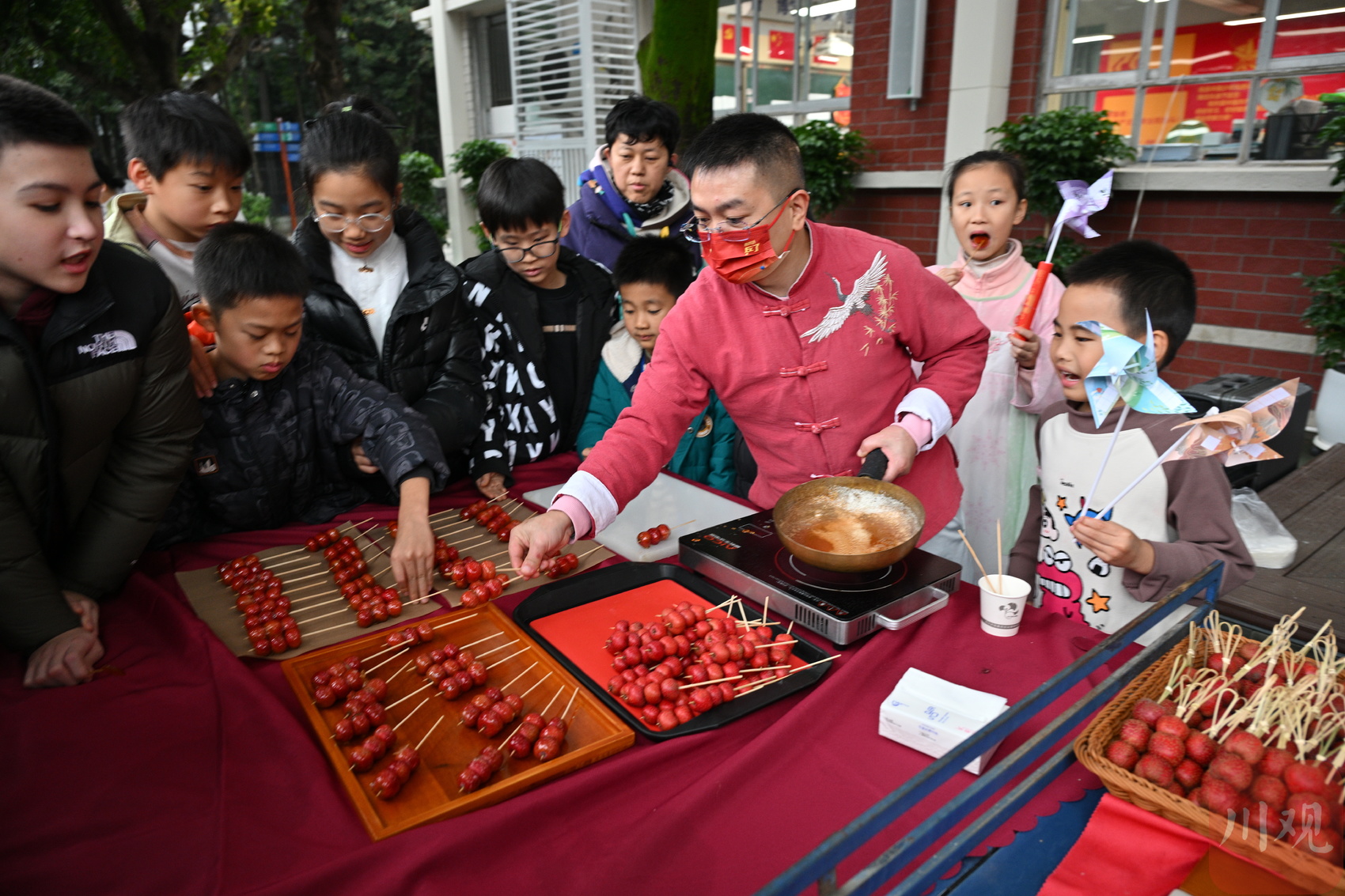 本次游园活动以“非遗遇上元旦”为构思线索,邀请了拓印(年画)、风车、成都糖画和糖葫芦四个非遗代表性项目的传承人亲临校园。孩子们不仅近距离观摩了非遗技艺的展示,还在传承人的指导下亲手体验制作过程。糖画摊位前,孩子们目不转睛地看着糖浆在传承人手中化作栩栩如生的动物图案;拓印体验区,一张张吉祥图样在孩子们手中诞生。