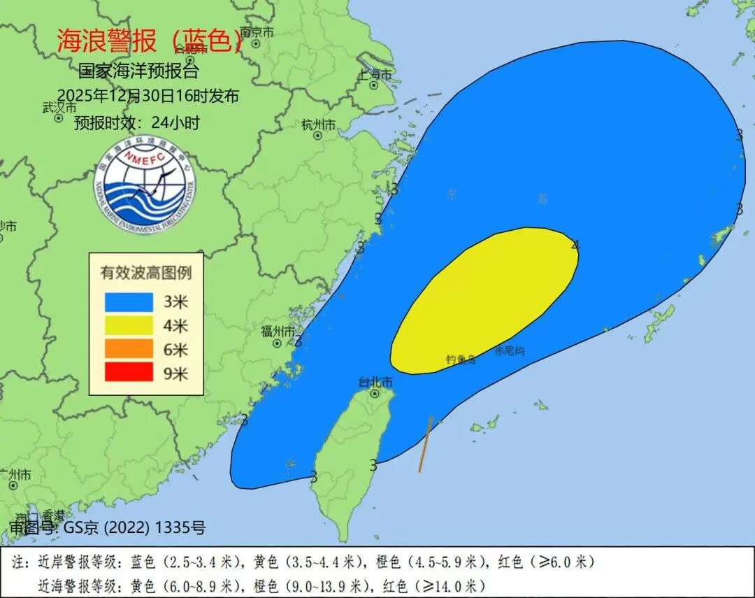 据央视新闻消息,受东海低压和冷空气的共同影响,预计今日上午到下午,东海南部、台湾海峡将出现2.5到4米的大浪到巨浪区;浙江、福建近岸海域将出现2到3米的中浪到大浪,近岸海域海浪预警级别为蓝色。