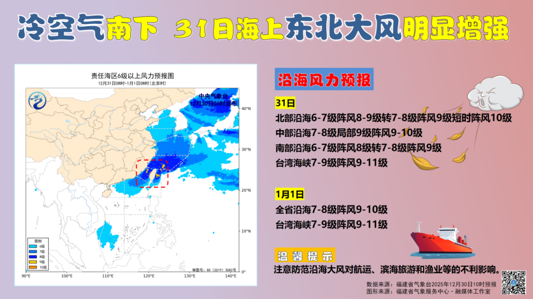 今日至元月2日,我省沿海海区有8级东北大风,最大阵风9-10级,要注意防范沿海大风对航运、滨海旅游和渔业等的不利影响。