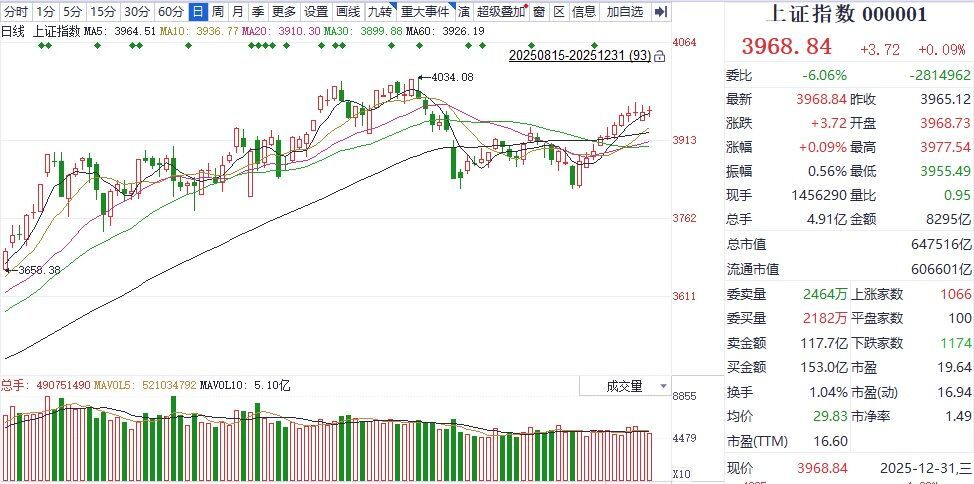 截至12月31日收盘,上证指数报收3968.84点,上涨0.09%;深证成指报收13525.02点,下跌0.58%;创业板指报收3203.17点,下跌1.23%。两市成交量呈现小幅下滑态势。