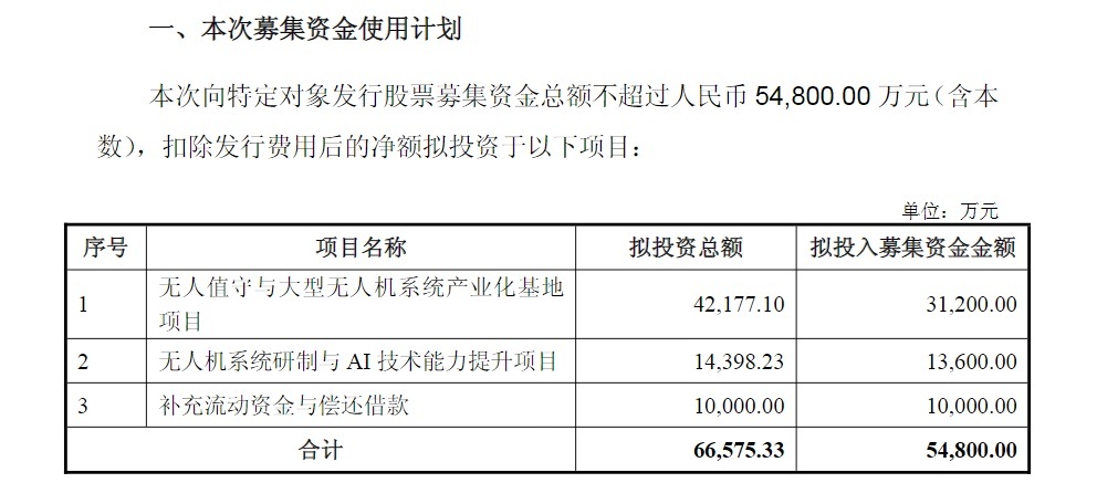 12月30日晚间,纵横股份发布公告称,公司计划通过定向增发方式募集资金,总额不超过5.48亿元。该笔资金将主要投向无人值守与大型无人机系统产业化基地项目、无人机系统研制与AI技术能力提升项目,剩余部分用于补充公司流动资金及偿还借款。公司表示,通过实施无人机系统项目,公司将大幅提升无人值守系统与中空长航时大型固定翼无人机的研发和量产能力,完善全方位、全场景、全系统低空数字经济解决方案,开拓长航时、大载重等应用场景的客户需求。