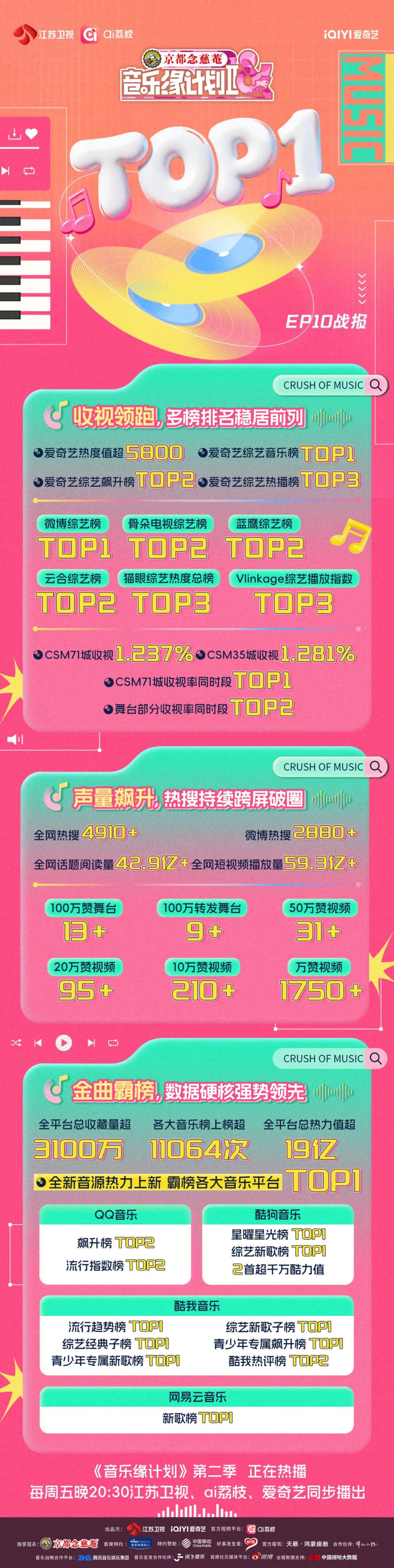 数据显示,本期节目收视CSM71城1.237%,CSM35城1.281%,居省级卫视同时段Top1。在各大社交平台,揽获全网热搜4910+,其中微博热搜2880+个,全网话题阅读量突破49.2亿+,短视频播放量达59.3亿+。节目歌曲在各大音乐平台收藏量累计突破3100万,总热力值超19亿,总上榜量超11064次,横扫QQ音乐、酷狗音乐、网易云音乐、酷我音乐等各大音乐榜单。