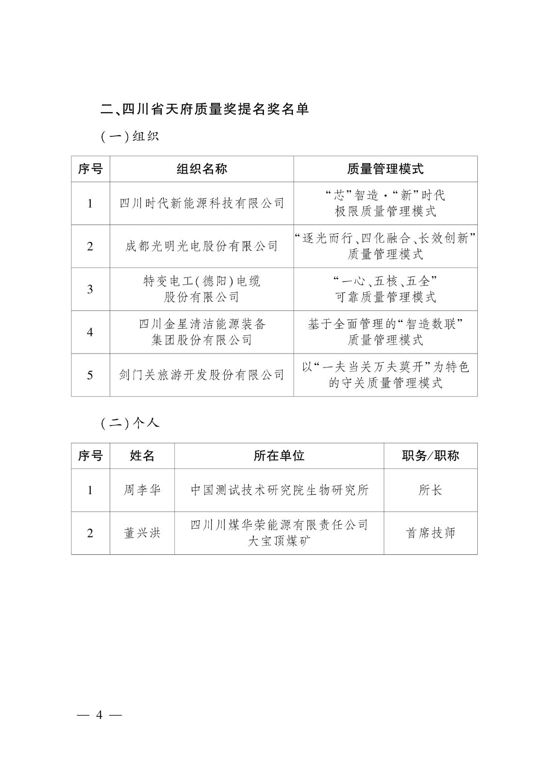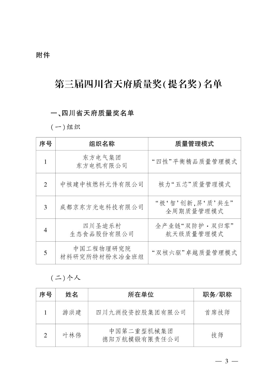 为深入学习习近平新时代中国特色社会主义思想,全面贯彻党的二十大和二十届历次全会精神,认真落实党中央、国务院关于质量强国建设的决策部署和省委、省政府工作安排,加快推进质量强省建设,树立质量管理先进典型和标杆,激励引导各行各业加强质量管理创新,助力建设现代化产业体系,经评审,省政府决定授予东方电气集团东方电机有限公司、中核建中核燃料元件有限公司、成都京东方光电科技有限公司、四川圣迪乐村生态食品股份有限公司、中国工程物理研究院材料研究所特材粉末冶金班组5个组织,四川九洲投资控股集团有限公司游洪建、中国第二重型机械集团德阳万航模锻有限责任公司叶林伟2名个人第三届四川省天府质量奖;授予四川时代新能源科技有限公司、成都光明光电股份有限公司、特变电工(德阳)电缆股份有限公司、四川金星清洁能源装备集团股份有限公司、剑门关旅游开发股份有限公司5个组织,中国测试技术研究院生物研究所周李华、四川川煤华荣能源有限责任公司大宝顶煤矿董兴洪2名个人第三届四川省天府质量奖提名奖。