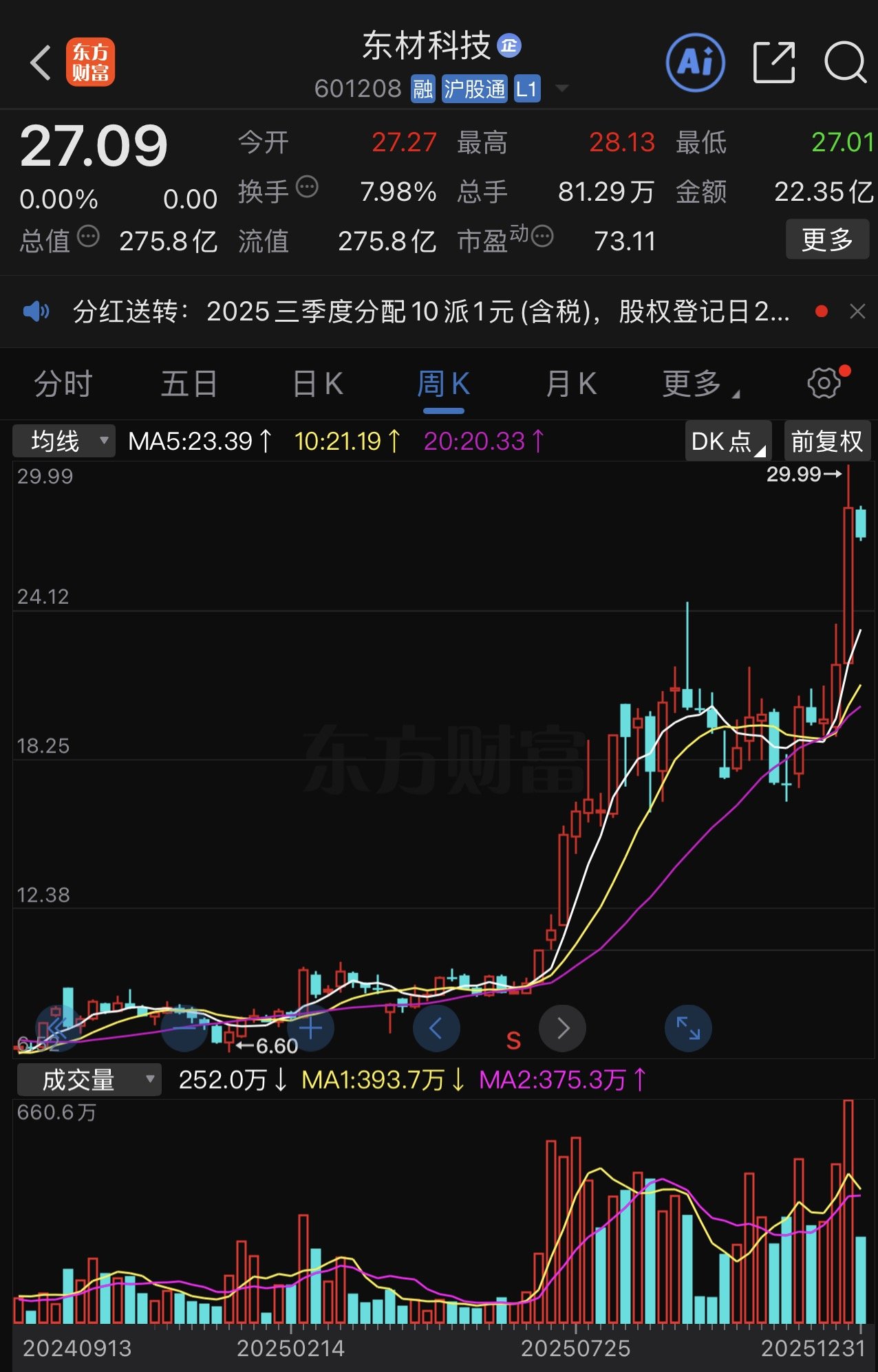 东材科技周K线图。东方财富截图