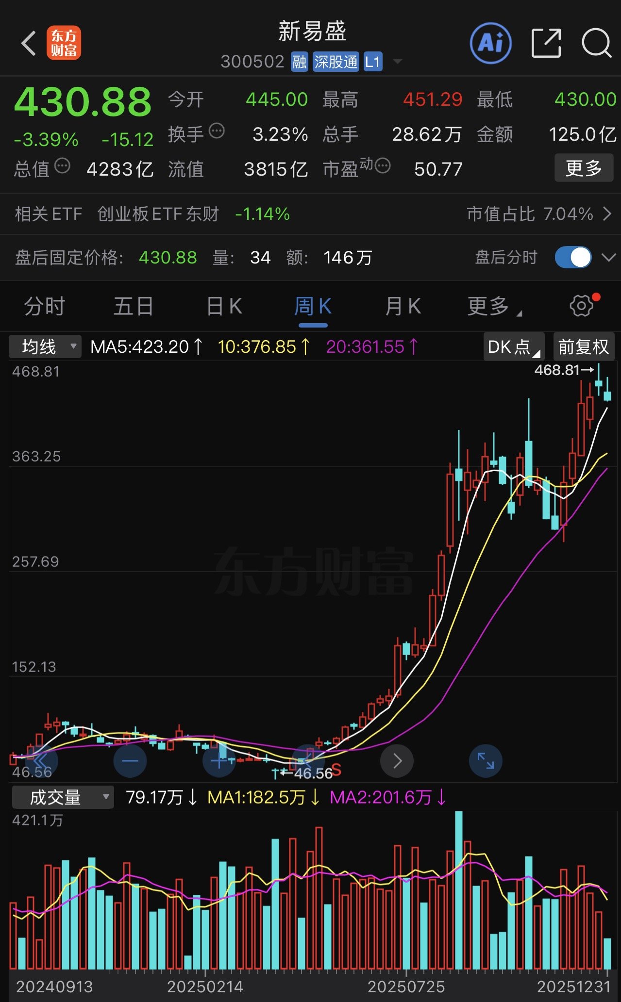 新易盛周K线图。东方财富截图
