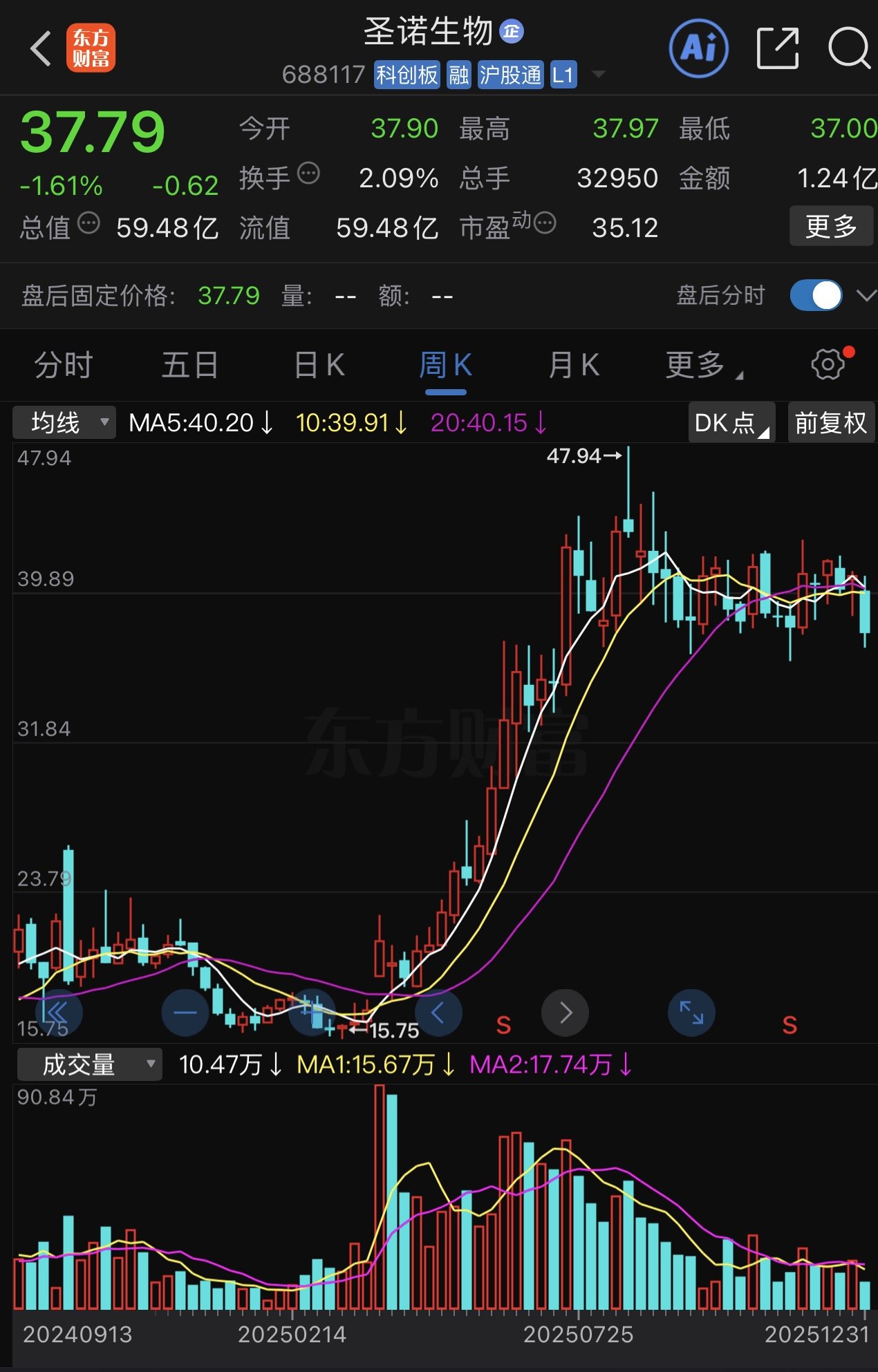 圣诺生物周K线图。东方财富截图