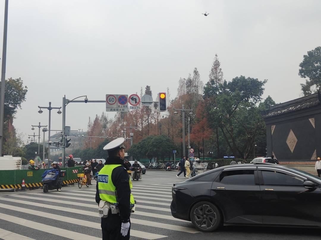“成都交警无人机违停抓拍记录中,未按规定停放将被记录,请即停即走,未及时驶离的,将依法予以处罚,谢谢配合!”12月31日下午,在成都市武侯祠景区外,一架警用无人机悬停在空中,向下方车辆喊话,提醒及时驶离,避免造成交通拥堵。