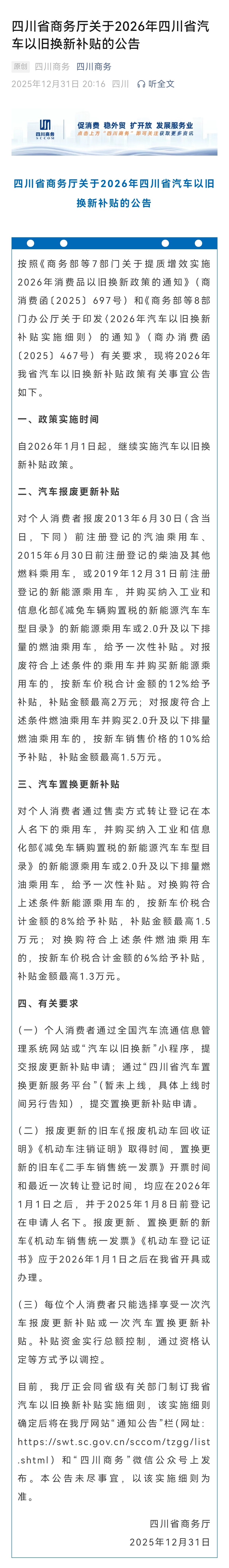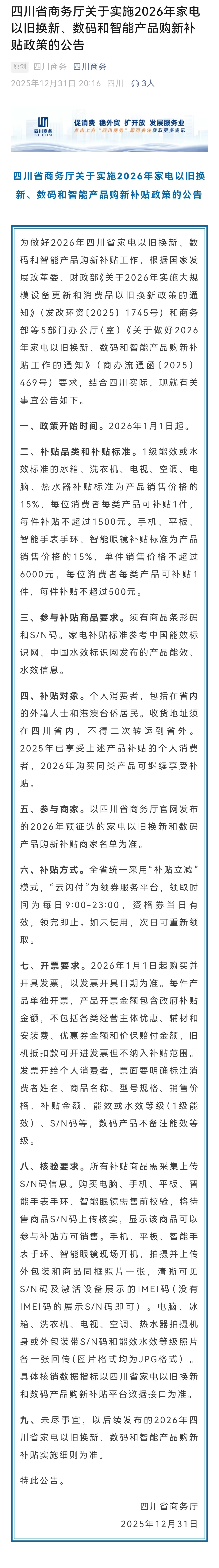12月31日晚,四川省商务厅发布了《四川省商务厅关于2026年四川省汽车以旧换新补贴的公告》《四川省商务厅关于实施2026年家电以旧换新、数码和智能产品购新补贴政策的公告》。明年四川消费品以旧换新到底有哪些国补政策?一起来看。