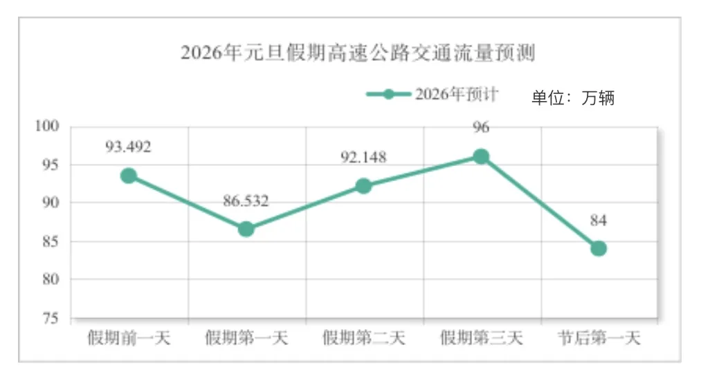 2026年元旦假期3天,高速公路7座及以下小客车不免费通行,相比2025年1天假期,时间明显延长,将有效刺激群众中短途出行需求,同时考虑车辆购置政策对车辆销售的带动作用,特别是今年元旦与春节间隔较久,将很大程度上激发探亲和返乡出行。受此影响,全省高速路网总流量将明显高于近2年元旦假期。与有可比性的2024年相比,预计全省高速公路日均交通流量增长20%,达到每日90万余辆次,峰值流量预计可达96万余辆次,总流量将达274万余辆次。