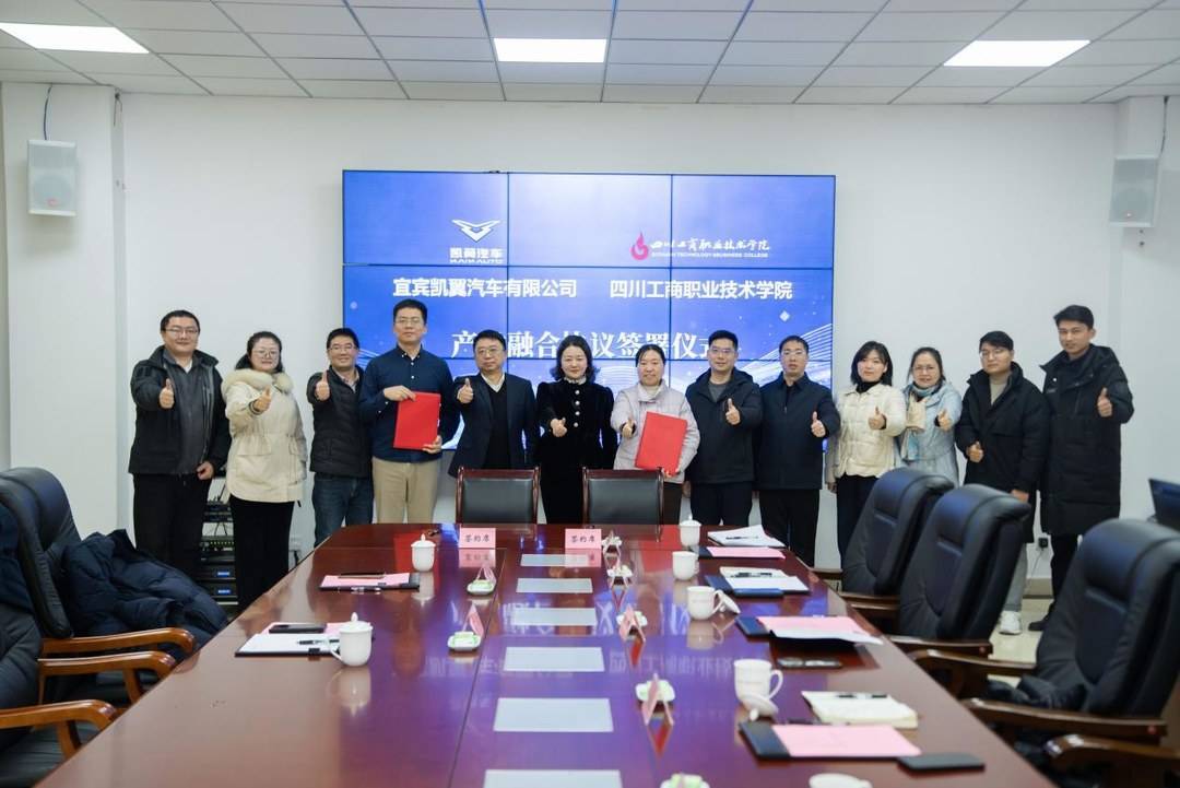 12月30日,四川工商职业技术学院与宜宾凯翼汽车有限公司正式签署产教融合协议,双方将围绕课程共建、实训基地共建、学生实习就业等多方面开展深度合作,旨在通过校企协同育人模式,为区域新能源汽车及先进制造产业输送高素质技术技能人才,助力产业高质量发展。