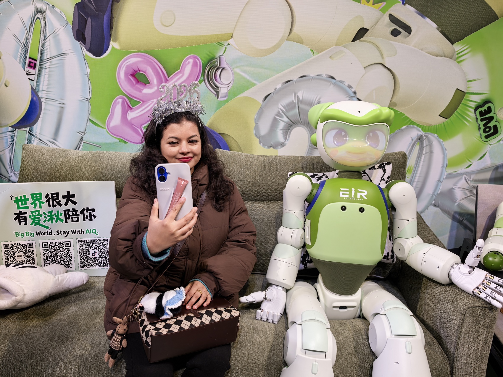 “太好玩了,它就像是我的数字镜像!”充满暖意的“心愿小屋”内,一位市民正与“爱湫”互动。当他对着“爱湫”大笑,对方面部立刻同步绽放出灿烂笑容。