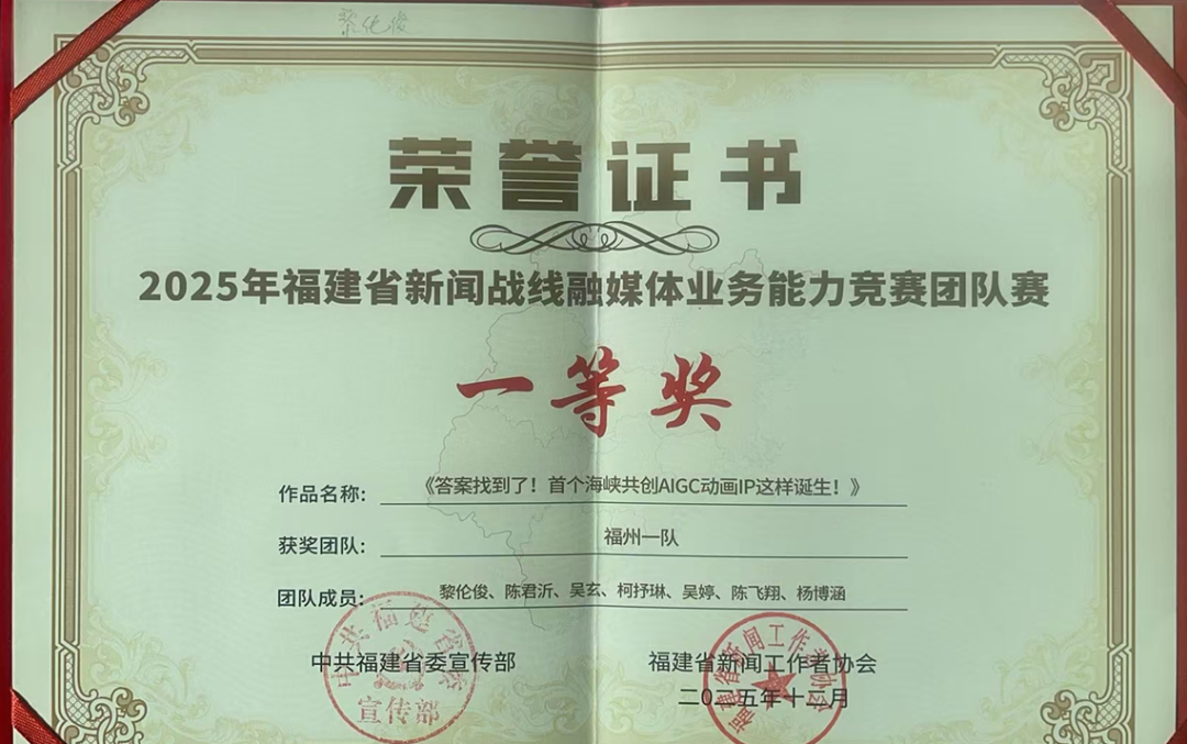 其中,福州日报社牵头组建的福州一队,获得团队赛一等奖;福州日报社记者参与组建的福建日报社观潮队,获得团队赛一等奖和AIGC短视频赛三等奖;福州日报社记者参与组建的福州三队,获得团队赛和AIGC短视频赛三等奖。