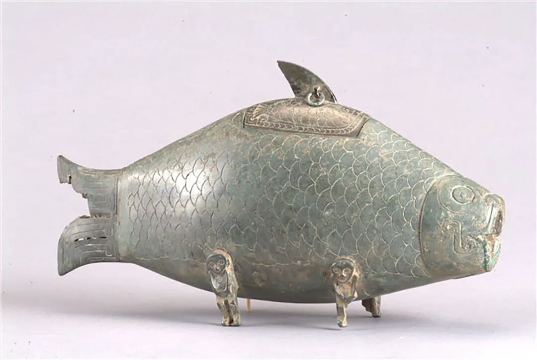 西周时期的鲤鱼尊,是我国首次发现的立体鲤鱼造型青铜器,它不是祭祀用的礼器,而是真正在饭桌上用的实用器。此尊通高15厘米,长28厘米,为鲤鱼形盛酒器,鱼身肥硕但比例协调,腹内中空。鱼口微启以作流,鱼背部有长方盖,酒水可从此处注入腹内。鱼腹下有两两相对、双手捧腹作负重状的4个“大力士”,表情夸张、生动有趣。