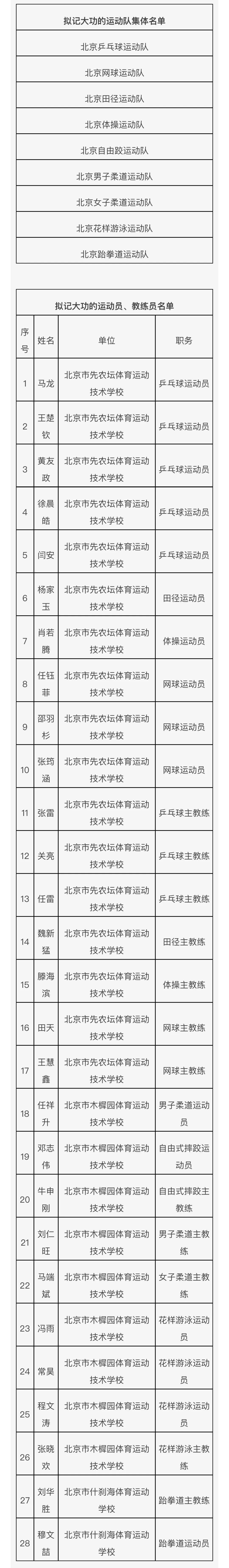 据北京市体育局官微消息,在第十五届全国运动会,北京体育健儿顽强拼搏、团结协作,圆满完成参赛任务,为首都体育事业再创佳绩。依据《北京市事业单位工作人员奖励实施办法》等文件规定,市人力资源社会保障局会同市体育局对在第十五届全国运动会上作出杰出贡献的北京运动员和教练员,开展记大功奖励工作。根据奖励工作部署,在有关单位积极推荐的基础上,经综合评审、统筹考虑,确定北京乒乓球运动队等9个集体,马龙等28位同志拟记大功对象。