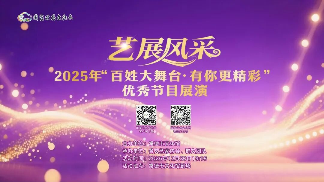 12月30日19:18,由常德市文化馆主办,常德市各文艺家协会、群文团队承办,文化和旅游部全国公共文化发展中心支持的“艺展风采”“百姓大舞台·有你更精彩”优秀节目展演将在湖南省常德市武陵区常德市文化馆剧场举行,国家公共文化云全程直播。