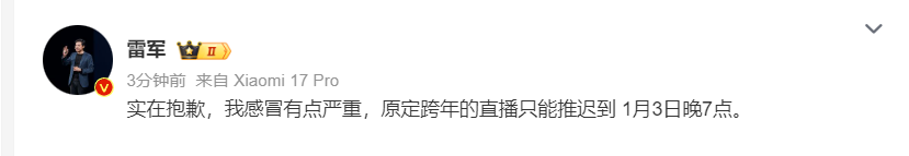 12月31日,雷军发文:实在抱歉,我感冒有点严重,原定跨年的直播只能推迟到 1月3日晚7点。