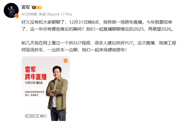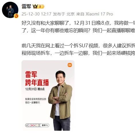 此前,小米创办人、董事长兼CEO雷军宣布,将于12月31日晚8点做一场跨年直播。