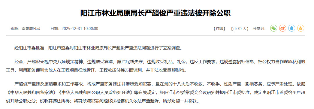 据阳江市纪委市监委官方微信公众号“漠海扬清”消息,经阳江市委批准,阳江市监委对阳江市林业局原局长严超俊严重违法问题进行了立案调查。