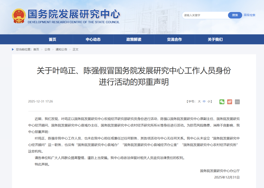 12月31日,国务院发展研究中心办公厅发布“关于叶鸣正、陈强假冒国务院发展研究中心工作人员身份进行活动的郑重声明”:
