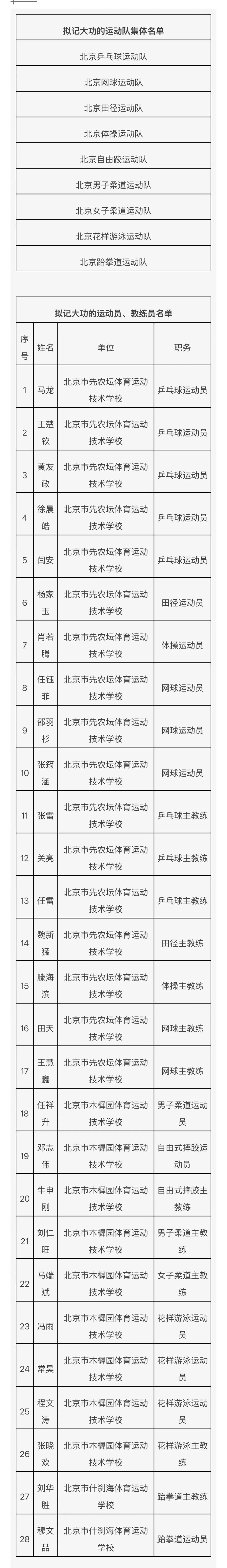 12月31日,据“体育北京”微信公众号消息,在第十五届全国运动会,北京体育健儿顽强拼搏、团结协作,圆满完成参赛任务,为首都体育事业再创佳绩。依据《北京市事业单位工作人员奖励实施办法》等文件规定,市人力资源社会保障局会同市体育局对在第十五届全国运动会上作出杰出贡献的北京运动员和教练员,开展记大功奖励工作。根据奖励工作部署,在有关单位积极推荐的基础上,经综合评审、统筹考虑,确定北京乒乓球运动队等9个集体,马龙等28位同志拟记大功对象。