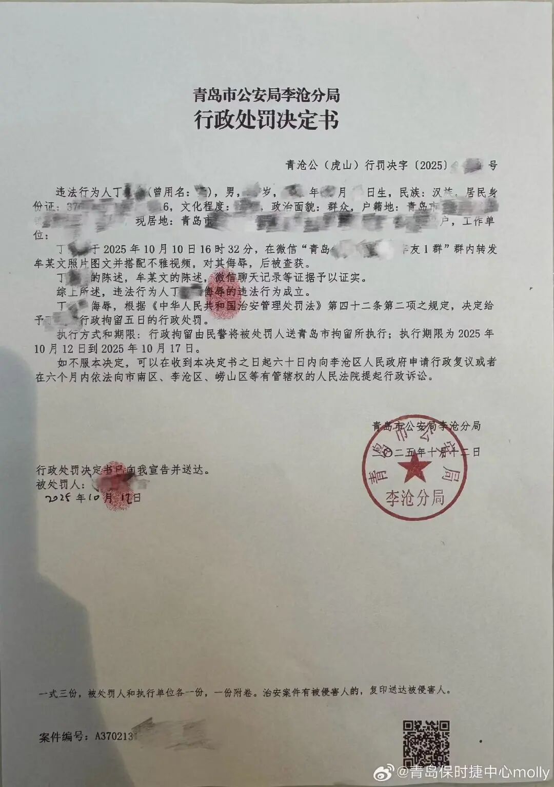 2025年10月,牟倩文遭遇了AI合成的虚假视频和不实信息的攻击。她在接受采访时坦言:“那些视频完全是伪造的。”事发后,她立即向公安机关报案。10月12日,她在社交账号上公布了青岛市公安局李沧分局的行政处罚决定书:一名男子因在微信群转发其照片并搭配不雅视频进行侮辱,被处以行政拘留五日。