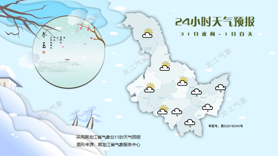 31日夜间最低气温:大兴安岭北部、伊春北部-36~-34℃,大兴安岭南部、黑河、伊春南部、绥化北部、哈尔滨北部-31~-29℃,齐齐哈尔北部、鹤岗、佳木斯东部、双鸭山东部-28~-26℃,其他地区 -25~-23℃。