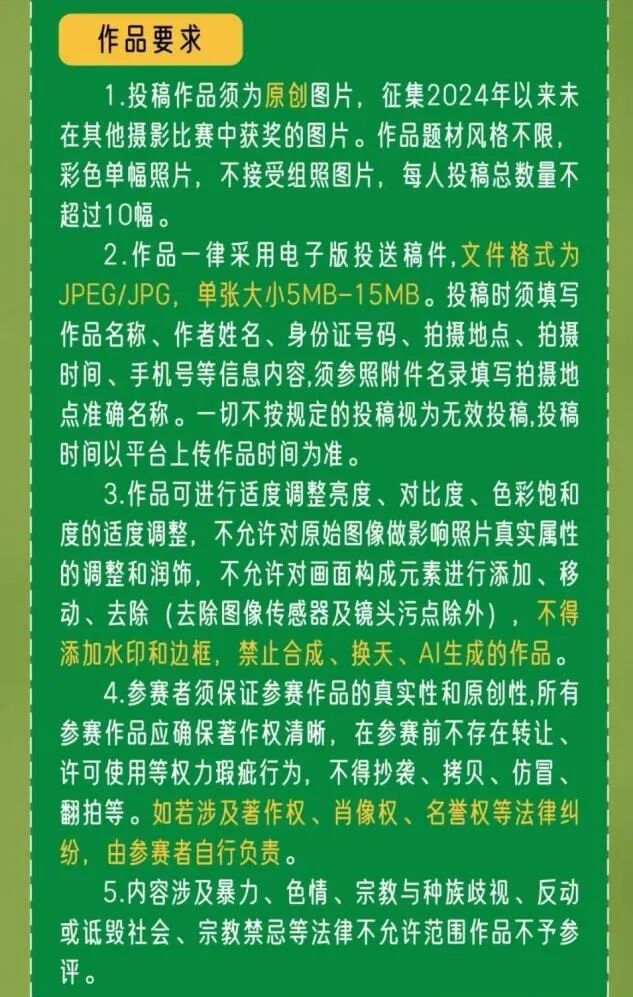 据悉,本次大赛明确要求投稿作品须为原创图片,禁止合成、换天及AI生成作品。参赛者需填写拍摄地点准确名称,并保证作品的真实性与原创性。