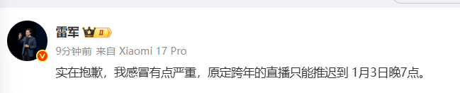 12月31日,雷军表示感冒有点严重,原定跨年的直播只能推迟到1月3日晚7点。