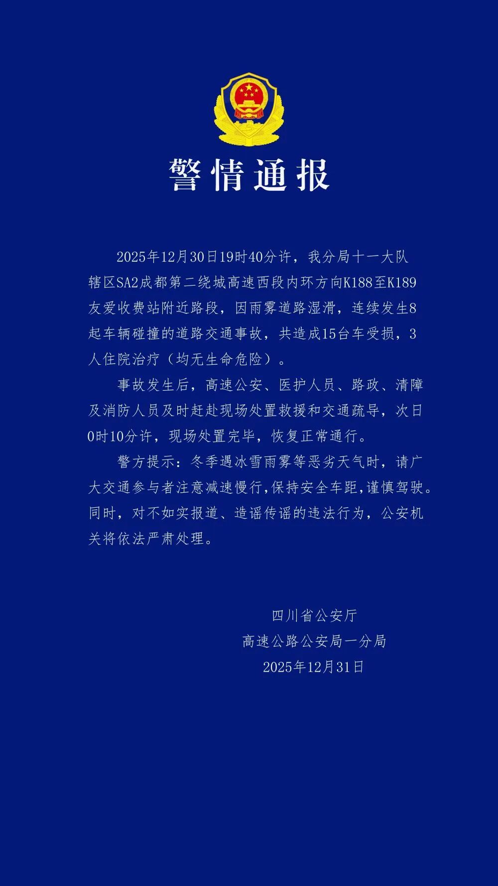 2025年12月30日19时40分许,我分局十一大队辖区SA2成都第二绕城高速西段内环方向K188至K189友爱收费站附近路段,因雨雾道路湿滑,连续发生8起车辆碰撞的道路交通事故,共造成15台车受损,3人住院治疗(均无生命危险)。