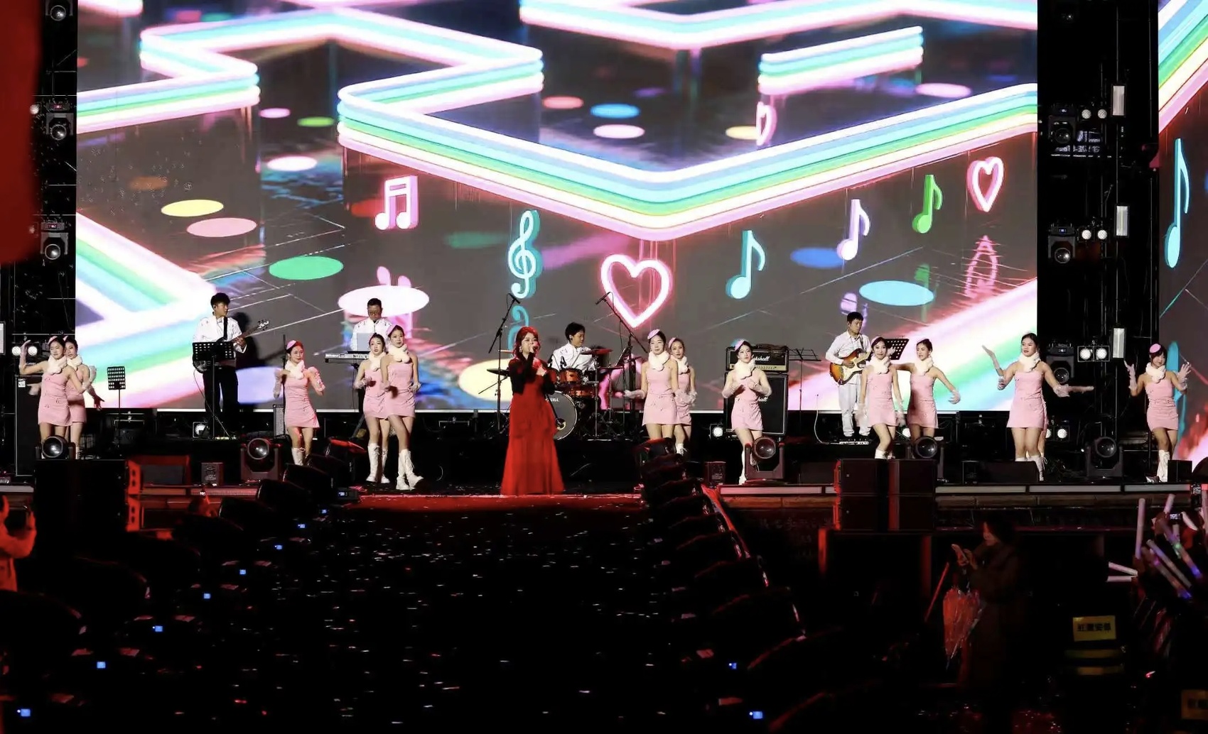 演出汇聚超过50首广受欢迎的热门曲目,表演形式融合震撼的灯光秀、经典华语音乐、动感舞蹈、深情对唱、质朴民谣、时尚T台秀、国风雅韵、热门抖音串烧、经典粤语歌以及激情摇滚等,为观众打造了一场沉浸式的视听盛宴。