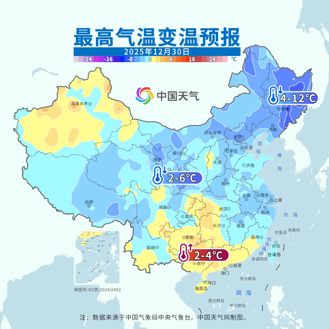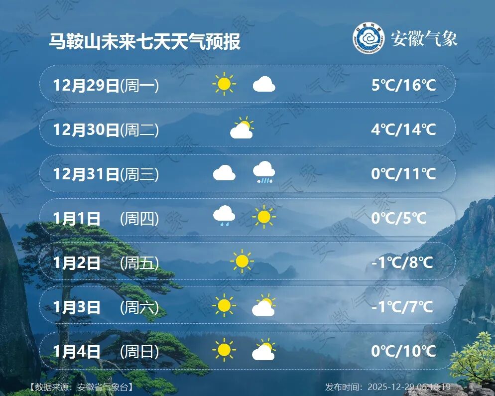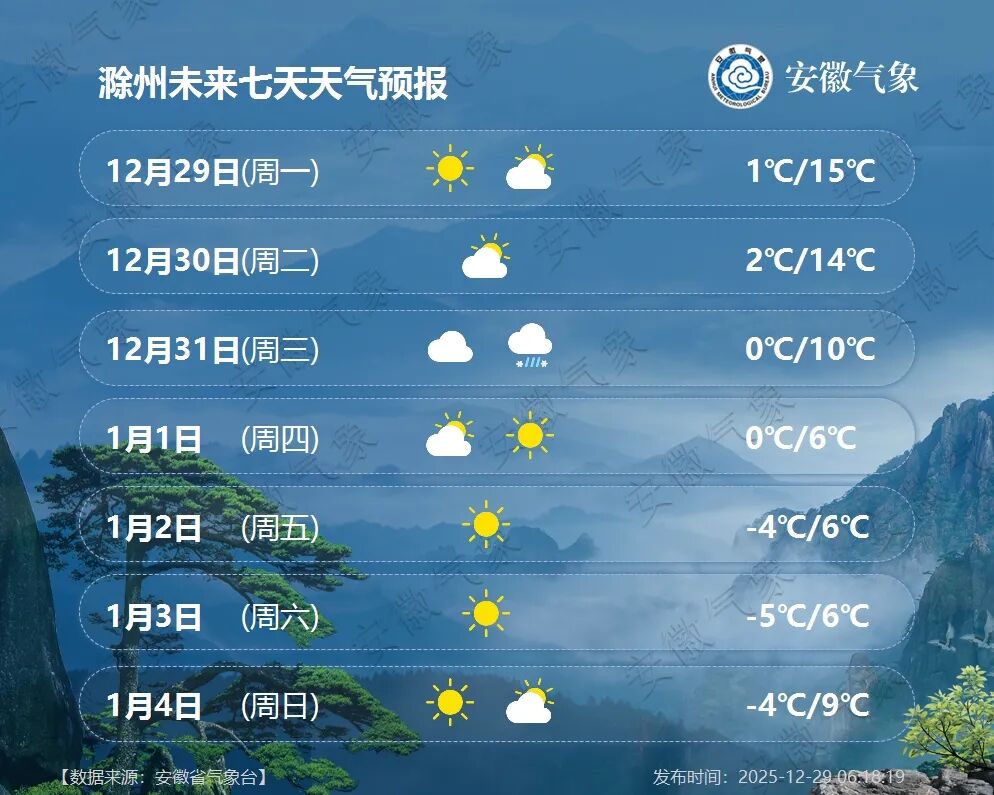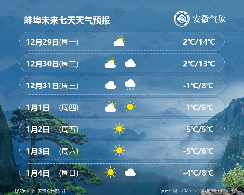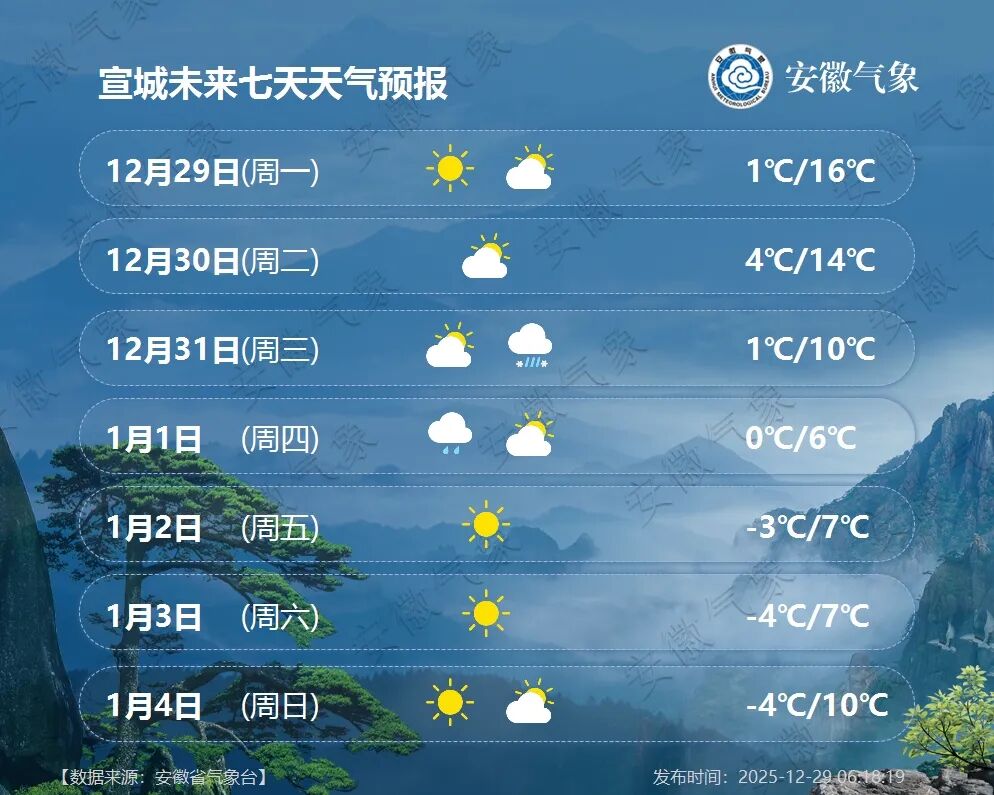 12月31日至2026年1月2日有强冷空气影响我省。31日和1月1日全省平均风力增大到3~4级,阵风7级。冷空气过后2-3日早晨最低气温:大别山区和皖南山区-10~-7℃,沿江地区-3~0℃,其他地区-7~-4℃。