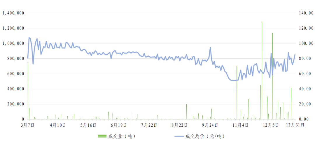 2025年,纳入碳排放权交易市场配额管理的重点排放单位共计3378家,其中发电行业重点排放单位2087家,钢铁行业重点排放单位232家,水泥行业重点排放单位962家,铝冶炼行业重点排放单位97家,市场共运行243个交易日。截至2025年12月31日,全国碳排放权交易市场配额累计成交量8.65亿吨,累计成交额576.63亿元。其中,2025年全年配额成交量2.35亿吨,同比增长约24%,成交额146.30亿元,交易规模持续扩大。交易价格保持在合理区间,年底收盘价为74.63元/吨,全年交易均价为62.36元/吨。组织完成8场单向竞价,满足市场多样化交易需求。