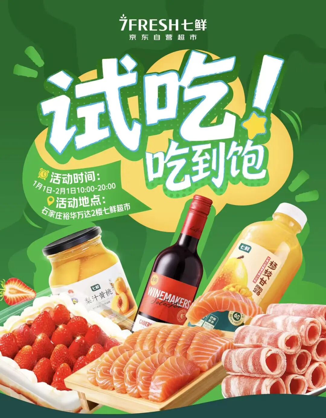 基于石家庄市民热烈的反馈,京东七鲜超市元旦期间继续在石家庄加码福利,自1月1日起开启“全场免费试吃”活动。不同于常规超市仅开放部分品类试吃,七鲜超市此次设置超40个试吃点位,覆盖烘焙、水果、熟食、酒饮等全品类的高人气产品。更令人惊喜的是,这场味蕾狂欢将从1月1日一直持续至2月1日,每天10时至晚20时全天候开放,让市民随时都能进店尝鲜。