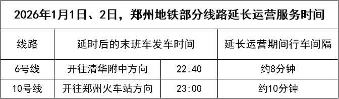 跨年夜延长运营时间。2025年12月31日,郑州地铁线网运营时间总体延长至次日1:00。1:00后将根据客流实际情况,适时组织加开列车。