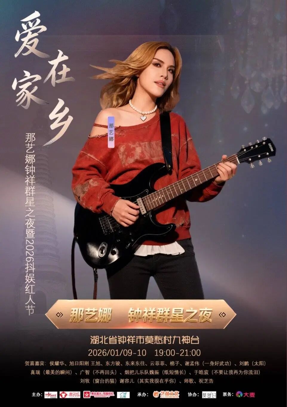 宣传海报显示,这场名为“爱在家乡·那艺娜钟祥群星之夜暨2026抖娱红人节”的晚会,将于2026年1月9日至1月10日晚,在钟祥莫愁村景区上演。晚会由当地网红那艺娜领衔,由曲艺演员侯耀华、歌手东来东往、旭日阳刚组合的王旭、音乐人东方骏等人为主要演员。另外,还有谢孟伟等一系列人员担任贺喜嘉宾。